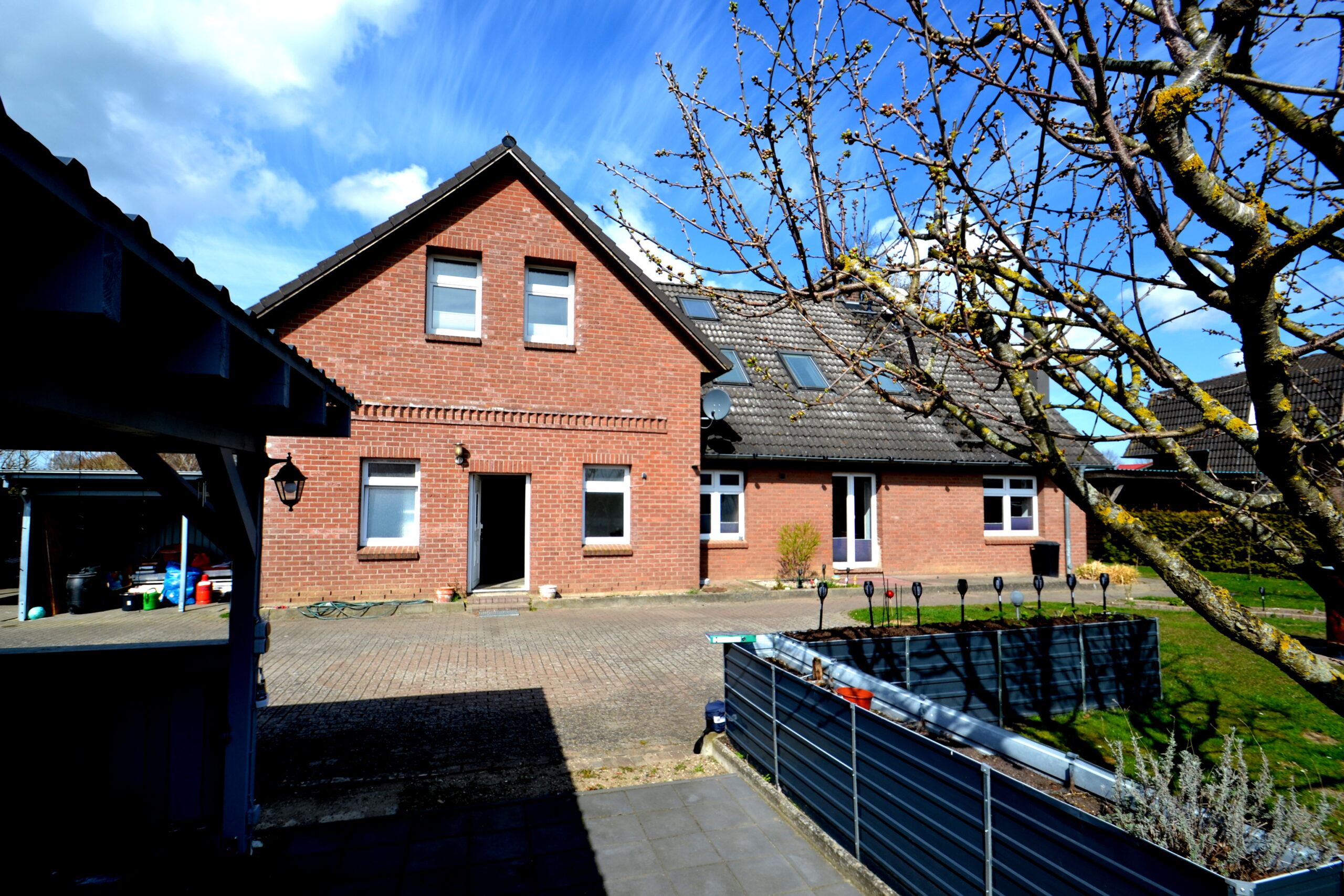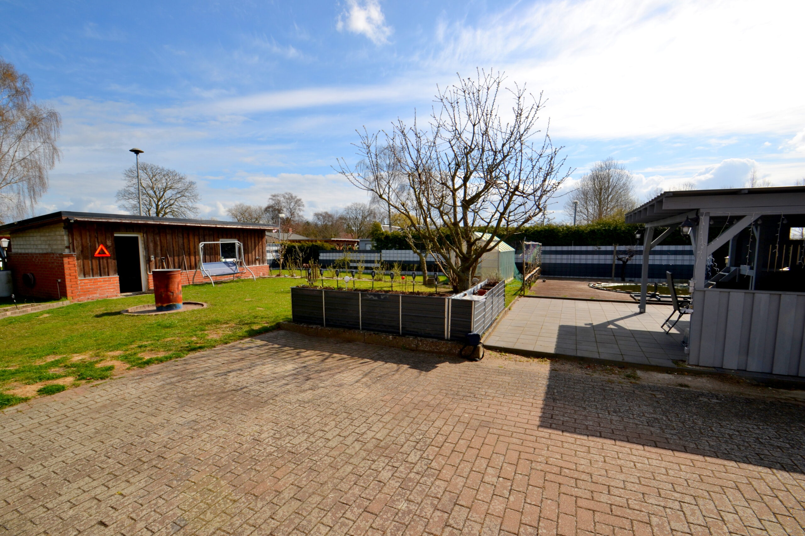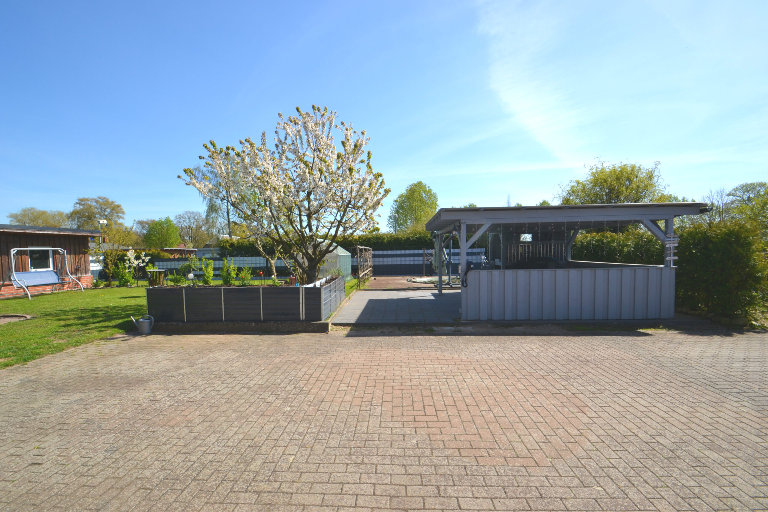 Der Außenbereich überzeugt durch eine gepflegte, übersichtliche Gestaltung: ein sonniger Garten mit Pool lädt zu entspannten Stunden im Freien ein, während die überdachte Terrasse Ihnen vielseitige Nutzungsmöglichkeiten bei jedem Wetter bietet. Für Fahrzeuge steht ein großzügiger Doppelcarport zur Verfügung, der praktischen Schutz bietet und die Gepflegtheit des Grundstücks komplettiert.