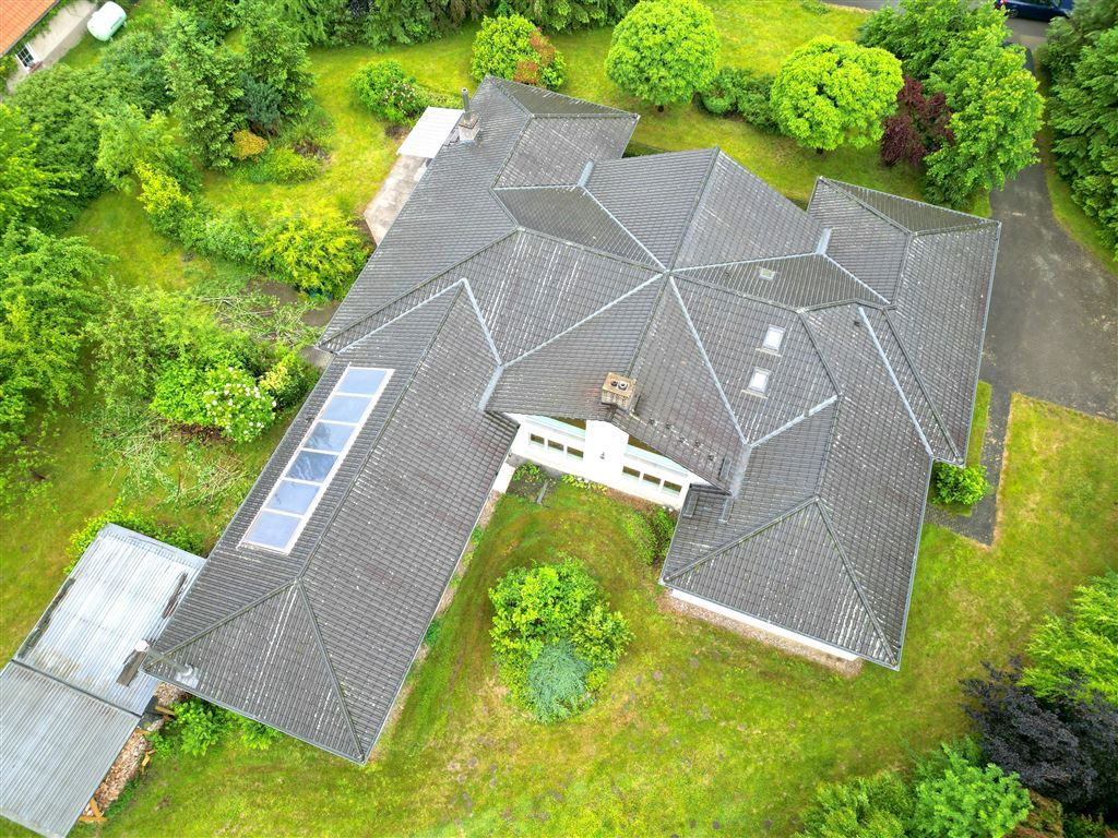 Willkommen in diesem imposanten, freistehenden Einfamilienhaus im amerikanischen Stil, das auf einer Wohnfläche von beeindruckenden 505 m² jede Menge Raum und Luxus bietet. Dieses großzügige Anwesen, erbaut im Jahr 2000, vereint moderne Annehmlichkeiten mit klassischem Charme. Ein besonderes Highlight ist die integrierte Einliegerwohnung, die sowohl von innen als auch über einen separaten Eingang zugänglich ist. Das Haus verfügt über eine Vielzahl von großen Schlafzimmern, Zwei offenen Küchen und praktischen Einbauschränken, die für ausreichend Stauraum sorgen. Der große Eingangsbereich empfängt Sie und Ihre Gäste stilvoll und geleitet Sie in den imposanten Salon, der zentral im Haus gelegen ist. Mehrere Kamine im Haus sorgen für eine gemütliche Atmosphäre, während die zuverlässige zentralheizung über Öl läuft. Der große Innenpool lädt zu entspannten Stunden ein und kann mittels Holz beheizt werden. Der teilweise unterkellerte Bereich von etwa 90 m² bietet viel Platz als Stauraum oder für diverse Hobbys. Das Haus ist einstöckig und mit einem Kaltdach ausgestattet. . Insgesamt gibt es drei Bäder, die den Wohnkomfort abrunden.